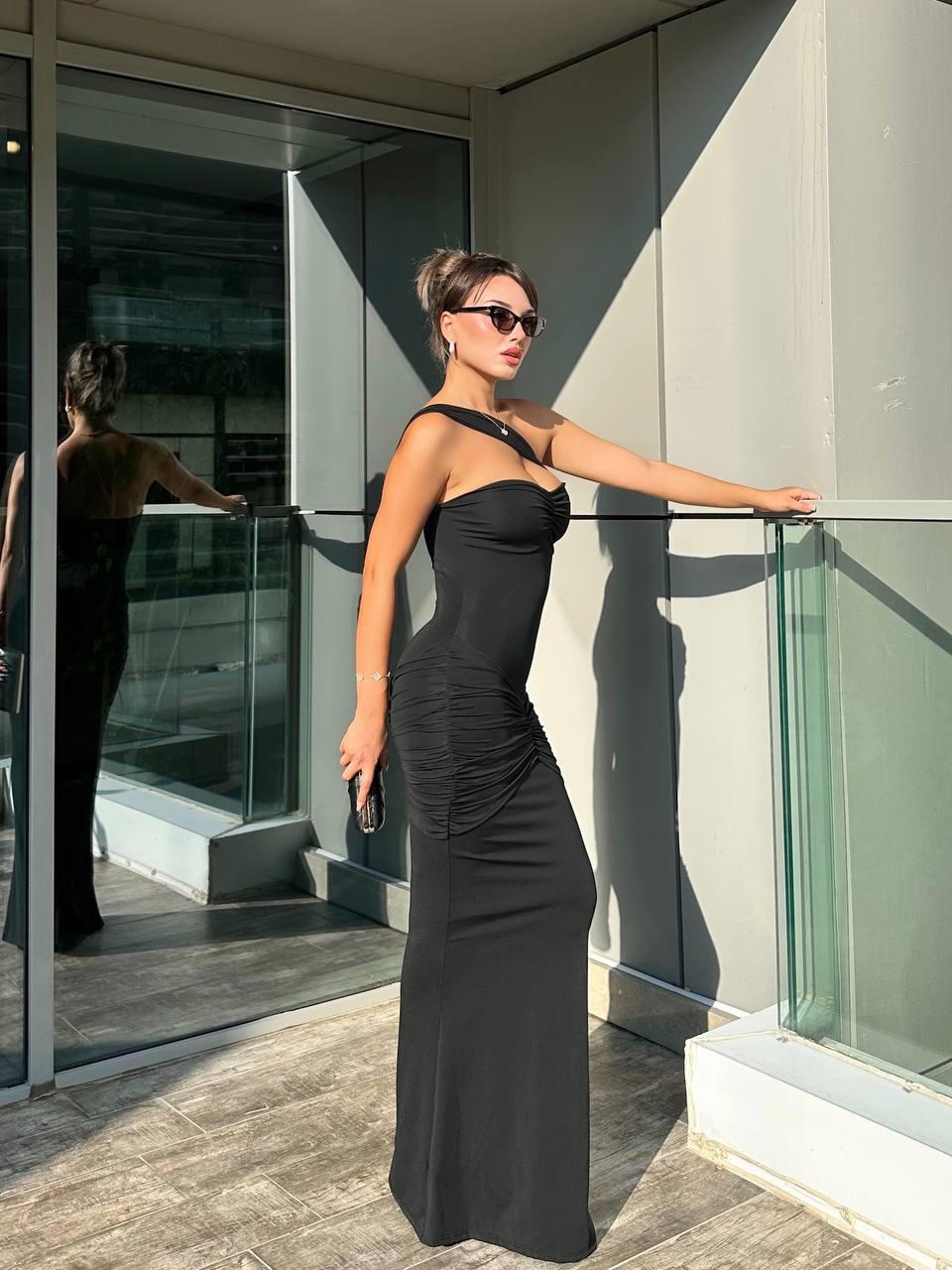 3 farklı yaka giyilebilen sırtı büzgülü maxi boy elbise - Lacivert